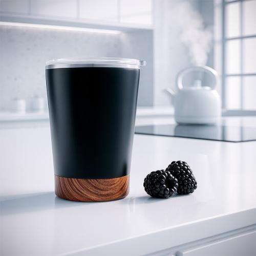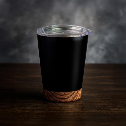 Стильная термокружка с черным матовым корпусом и декоративной вставкой с имитацией фактуры дерева soft-touch. Двойные стенки из стали сохранят напиток горячим до 3х часов. Высота без крышки 11,4 см, подходит для большинства кофемашин. Индвидуальная упаковка - белая картонная коробка