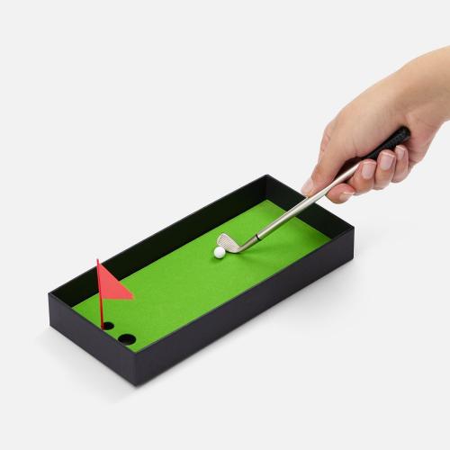 В комплекте: 3 клюшки-ручки со сменным стержнем с синими, черными и красными чернилами, 2 мячика для гольфа, флажок и подарочная коробка.