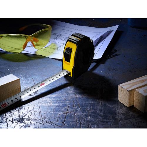Длина измерительной ленты 5 метров позволяет работать на больших расстояниях. Лента оснащена магнитным наконечником для надежного сцепления с металлическими поверхностями. Корпус рулетки выполнен из прочного пластика с накладкой из ПВХ, которая предотвращает скольжение инструмента в руке.