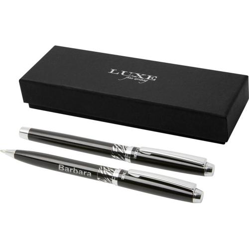 Шариковая ручка и ручка-роллер с декоративным узором на корпусе. Шариковая ручка предварительно заполнена синими чернилами, а ручка-роллер предварительно заполнена черными чернилами. Упакована в подарочную коробку LUXE. Латунь.
