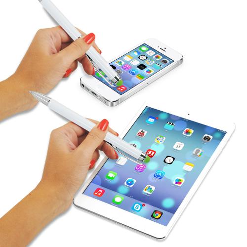 Алюминиевая ручка с белым корпусом, цветной вставкой и стилусом в цвет вставки.