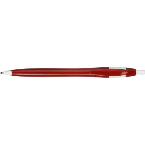 Простая, но стильная пластиковая ручка с цветным корпусом и белыми вставками на носике, кнопке и под клипом. Белые вставки делают ручку более заметной, не отвлекая от рекламной информации на ее корпусе.