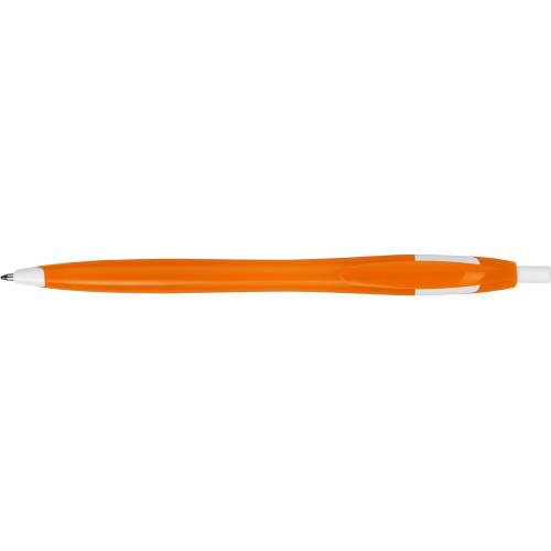 Простая, но стильная пластиковая ручка с цветным корпусом и белыми вставками на носике, кнопке и под клипом. Белые вставки делают ручку более заметной, не отвлекая от рекламной информации на ее корпусе.