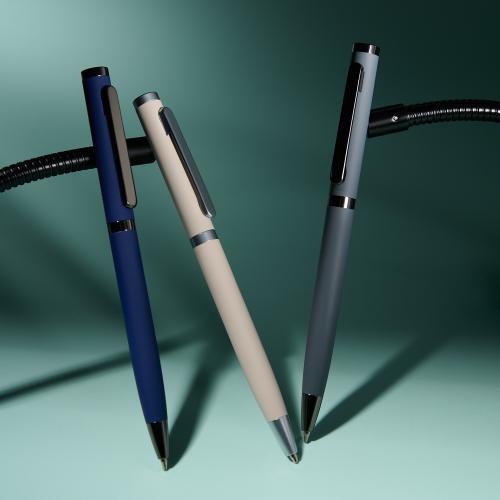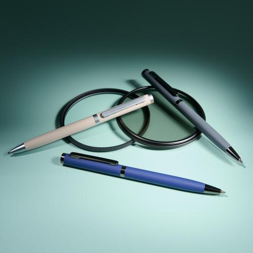 Классическое матовое софт-тач покрытие корпуса обрамляется качественной хромированной отделкой, которая добавляет ручке изящности. Стержень легко выдвигается благодаря поворотному механизму, ручка не скользит в руке и комфортно ощущается при письме за счет покрытия. Плавно пишущие синие чернила Documental (Германия) обеспечивают качественное и мягкое письмо.