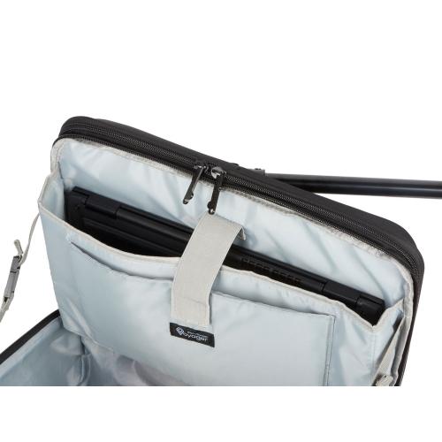 - большое отделение с карманами для ноутбука и планшета и пространством для одежды с фиксатором-пряжкой