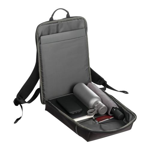 Ноутбук разместится в глубоком кармане внутри основного отделения рюкзака, также предусмотрены два небольших кармашка для мелочей. Основное отделение закрывается на двойную молнию. С лицевой стороны небольшой карман на молнии. Короткая верхняя ручка для переноски изделия в руках. Лямки — широкие, регулируемые по длине. Они хорошо облегают плечи и равномерно распределяют нагрузку.