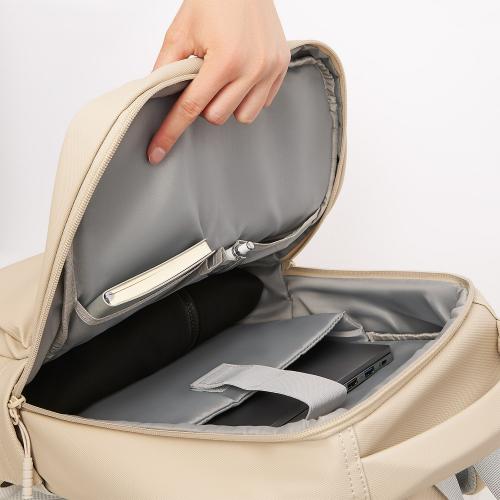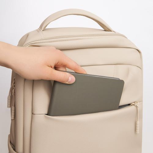 На внешней стороне расположен глубокий карман на скрытой молнии для хранения мелочей, а боковые карманыоснащены фиксаторами для комфортной эксплуатации. Есть багажная лента на спинке. Рюкзак имеет две мягкие регулируемые лямки, а верхняя мягкая ручка дополнена ручкой-петлёй.
