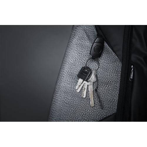 - На внешней стороне рюкзака в стыке серого и черного цвета спрятался треугольный карман на молнии с застежкой фастекс для ключей, которая позволяет легко отстегнуть или пристегнуть ключи