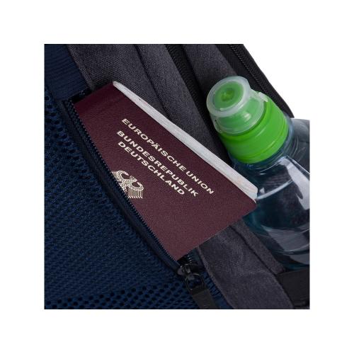 Рюкзак в спортивном стиле из высококачественной, водоотталкивающей ткани. При производстве каждого рюкзака используется эквивалент 11 пластиковых бутылок по 500 мл. • Легкий, но имеет утолщенные стенки для защиты ноутбука от случайных ударов и царапин, а также от пыли и влаги. • Основное отделение для ноутбука с вертикальной загрузкой, имеет мягкие стенки и ремень для надежной фиксации ноутбука до 15.6''. • Дополнительное внутреннее отделение для планшета до 10.5''. • Внешнее переднее отделение на молнии для хранения аксессуаров, также оборудовано панелью-органайзером для хранения визитных карт, флэш-накопителей, смартфона. Также на передней панели карман на молнии для различных мелочей. • Два боковых кармана для ёмкостей с водой. • Двойная застежка молния для удобного доступа к устройству. • Удобная мягкая ручка для переноски и наплечные ремни со смягчающими подкладками помогут чувствовать себя комфортно в самом долгом путешествии. • На задней стенке имеется ремень крепления к багажной сумке и скрытый карман на молнии для паспорта, бумажника. • Специальная система крепления ремешков на липучке закрепляет их и создает дополнительное удобство.