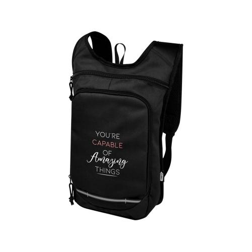 Рюкзак Trails изготовлен из 100% переработанной по стандарту GRS водоотталкивающей ткани и имеет один передний карман на молнии и одно основное отделение на молнии, а также отделение для гидросистемы. Светоотражающие полосы для видимости и сетчатая задняя часть для комфорта при переноске делает его отличным экологичным выбором для активного отдыха.
