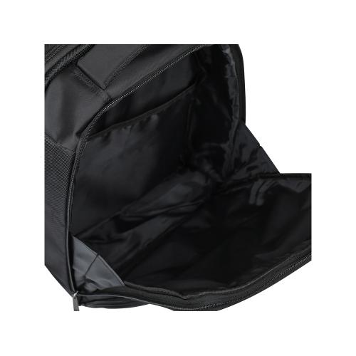 Рюкзак для ноутбука с двумя наружными фронтальными карманами на молнии. Одно отделение для ноутбука. Второе широкое отделение можно использовать для одежды при поездках в командировку. Сбоку сетчатый карман для зонта или бутылки. Сетчатая спинка. Лямки регулируются по длине.