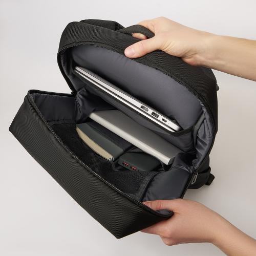 В основном отделении есть уплотнённый глубокий карман для ноутбука (до 15,6") и два органайзера для вещей. Внешний карман на молнии подходит для хранения важных мелочей: ключей, кошелька и наушников.