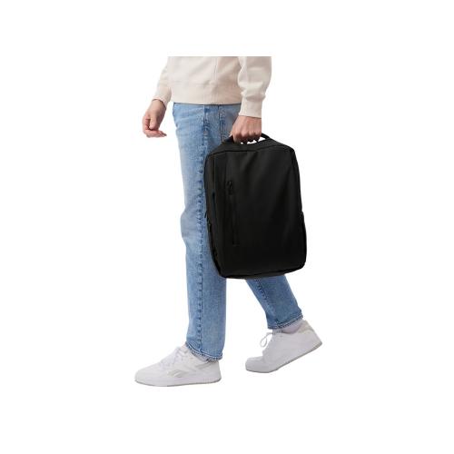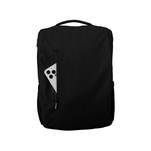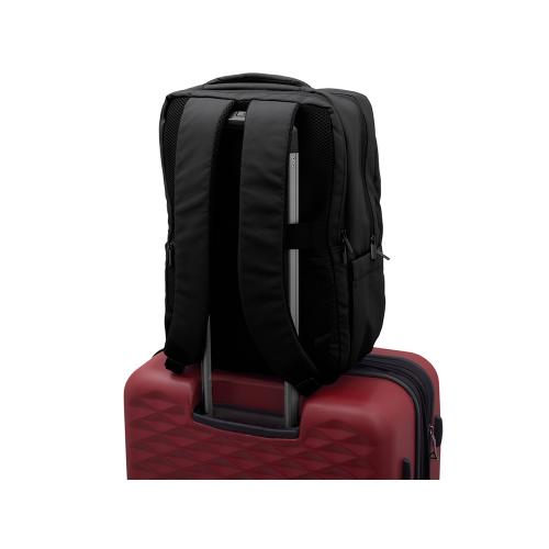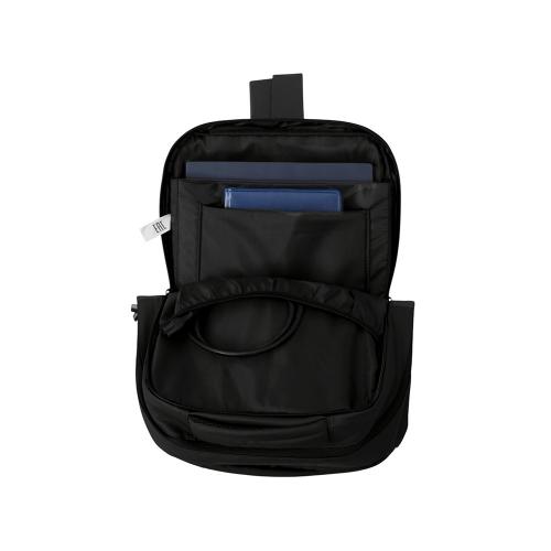 Непромокаемый бизнес рюкзак с двумя вместительными отделениями и карманом на молнии спереди. В одном отделении расположены карман для ноутбука и планшета, в другом органайзер и много пространства для одежды и других вещей на случай деловой поездки. На сетчатой спинке расположен потайной кармана на молнии для документов и личных вещей и ремень для крепления на ручку чемодана. Сверху удобная мягкая ручка для переноски. Лямки регулируются по длине.