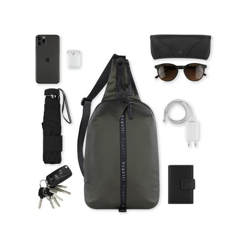 Внешняя организация: передний карман на молнии с открытым карманом, задний потайной карман на молнии, малый карман на молнии на ремне, верхняя ручка, регулируемый мягкий плечевой ремень со съёмным карабином для ношения рюкзака с правой или с левой стороны (до 80 см)