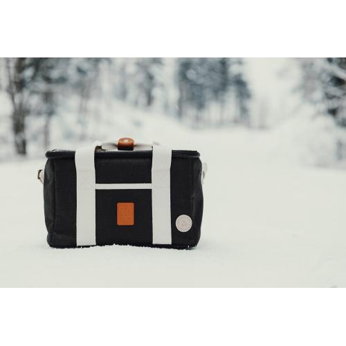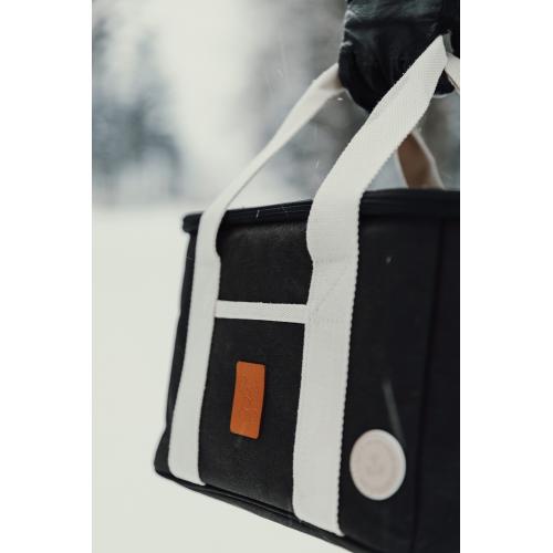 Это универсальная сумка-холодильник с контрастными деталями на 50% изготовлена из rPET, переработанных пластиковых бутылок. Снаружи есть небольшое отделение для важных мелочей. Благодаря плотному подкладу из PEVA сумка легко моется и долго сохраняет холод. Есть регулируемый плечевой ремень и короткие ручки.