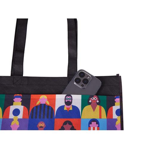 Для размещения принта подходит передний карман, на котором можно выполнить полноцветную печать. На поверхности кармана можно разместить лого компании или выставки, а также полноразмерный принт любой сложности.
