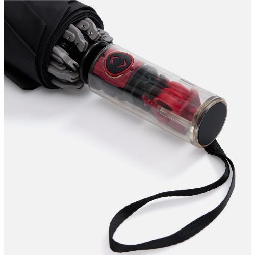 Складной зонт Futurum привлекает внимание оригинальным дизайном. Складываясь после дождя, он прячет мокрую поверхность в себя, а сухая остается снаружи. Светоотражающий кант и ручка из прозрачного пластика, не скрывающая ярких деталей внутри, добавляют внешнему виду зонта футуристичности.