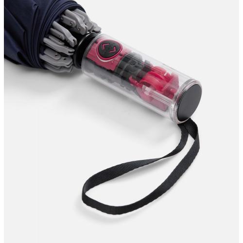 Складной зонт Futurum привлекает внимание оригинальным дизайном. Складываясь после дождя, он прячет мокрую поверхность в себя, а сухая остается снаружи. Светоотражающий кант и ручка из прозрачного пластика, не скрывающая ярких деталей внутри, добавляют внешнему виду зонта футуристичности.
