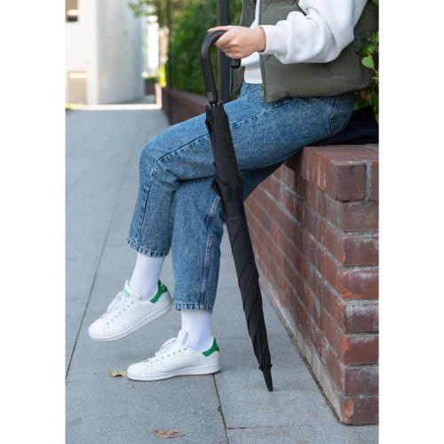 Складной зонт с необычным куполом в форме квадрата. Основной материал — практичный эпонж, который благодаря текстуре не впитывает влагу и быстро высыхает. Каркас, а именно спицы, из стеклопластика.
