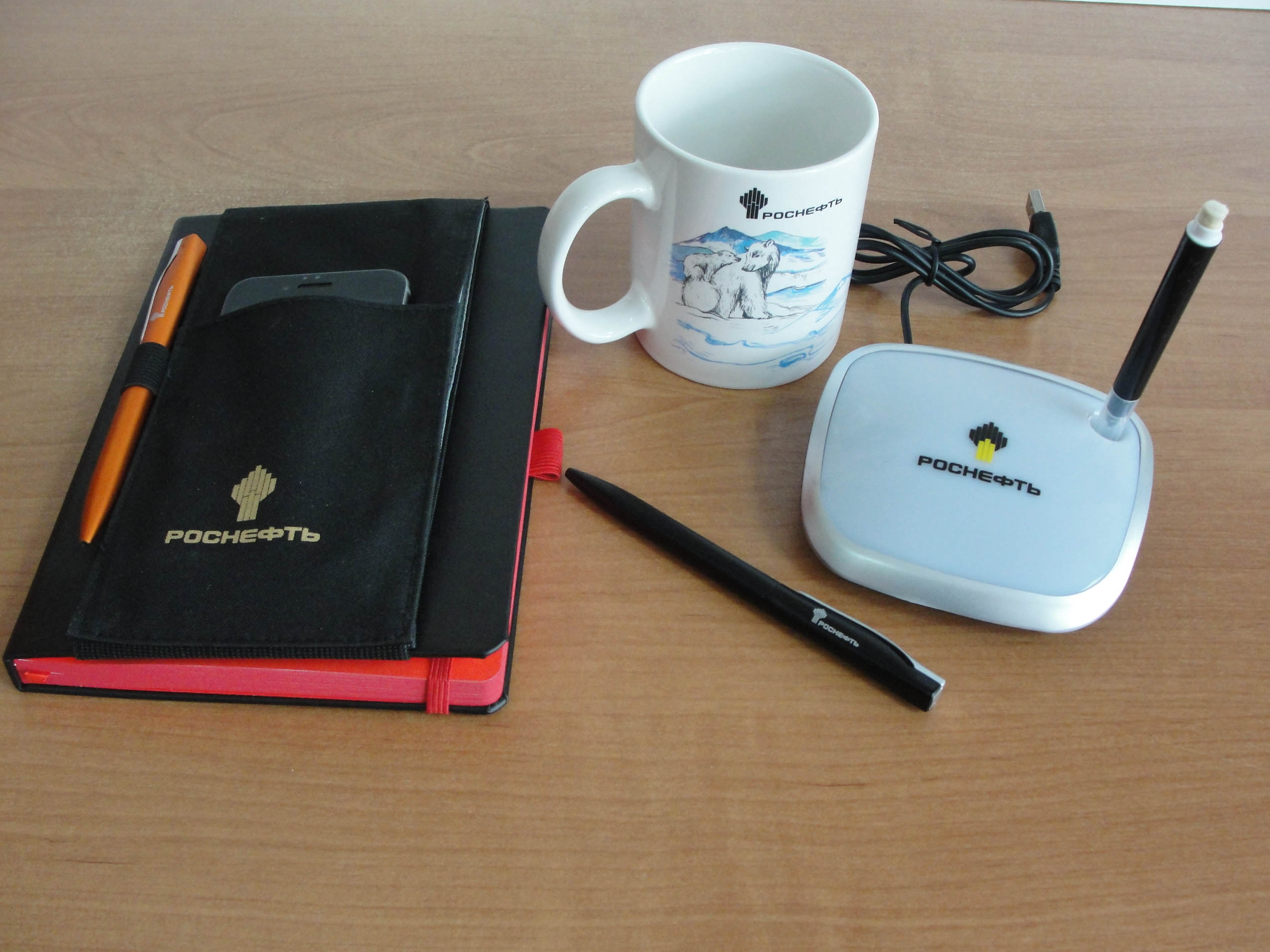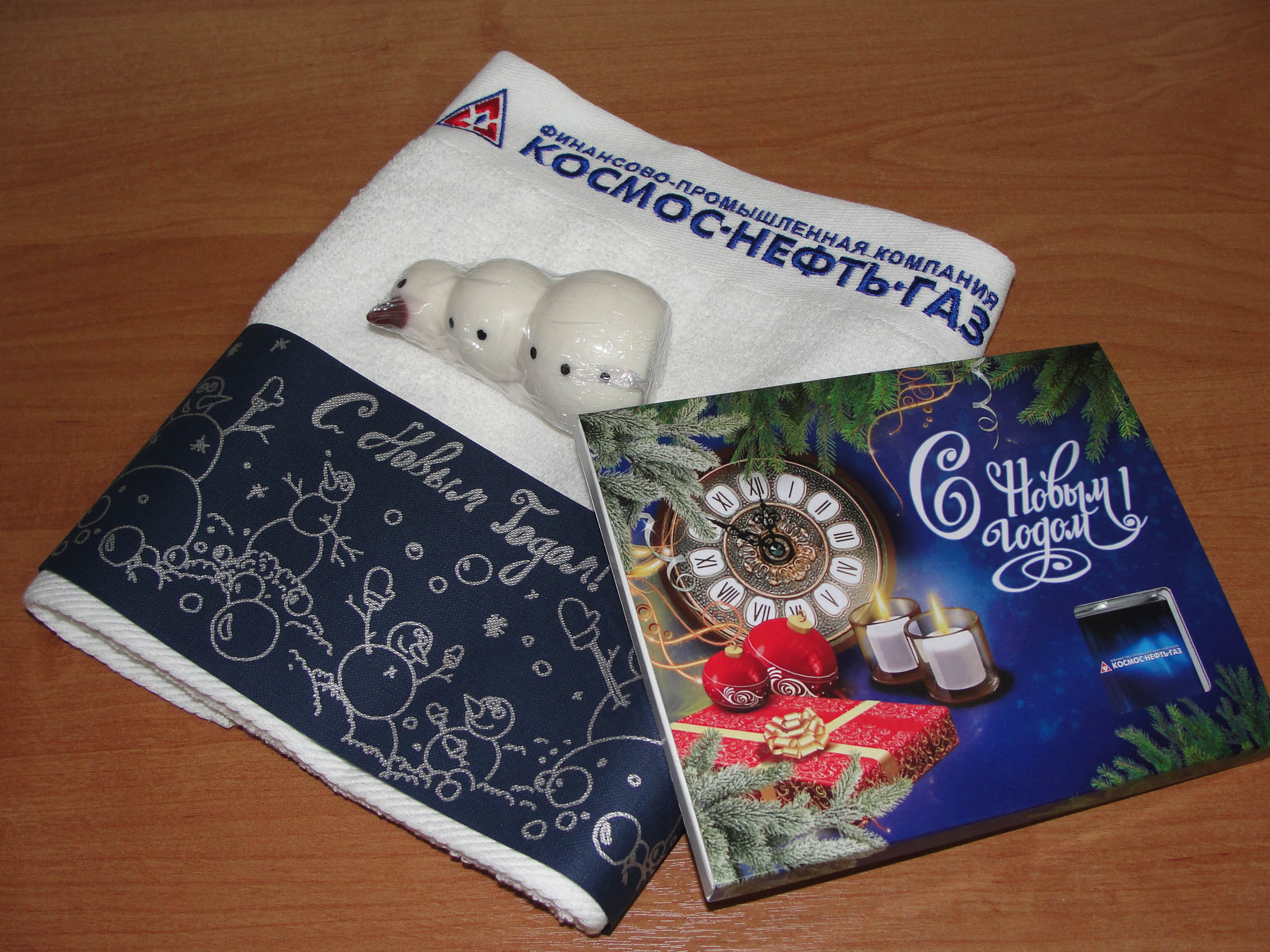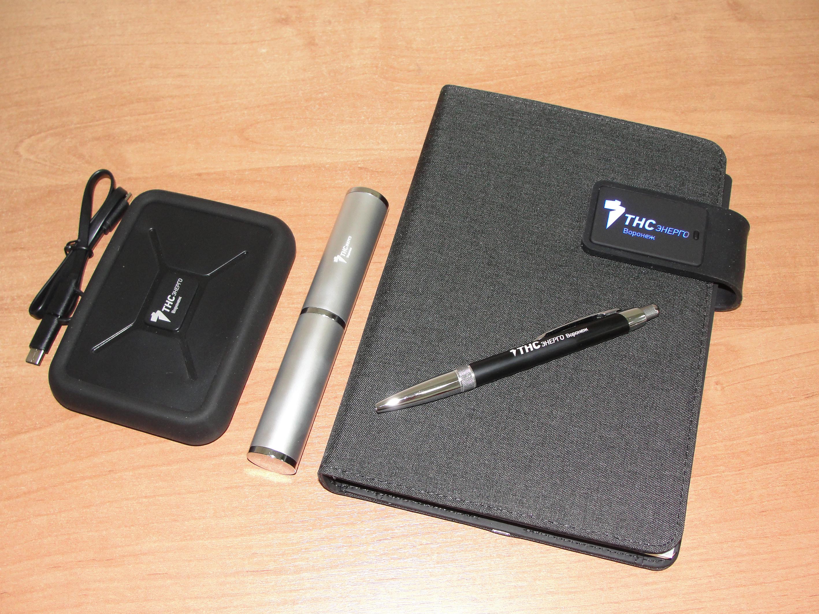 VIP-набор новогодних сувениров для компании «ТНС энерго»: органайзер с блокнотом (подсветка логотипа), ручка в металлическом футляре, аккумулятор-канистра.