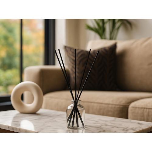 Прозрачный флакон без лишних деталей гармонично впишется в любой интерьер, а чёрные фибровые палочки обеспечат равномерное и продолжительное распространение аромата.