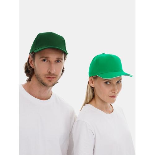 Модель бейсболки с 5-ю клиньями без лобового шва из плотного чесаного хлопка.