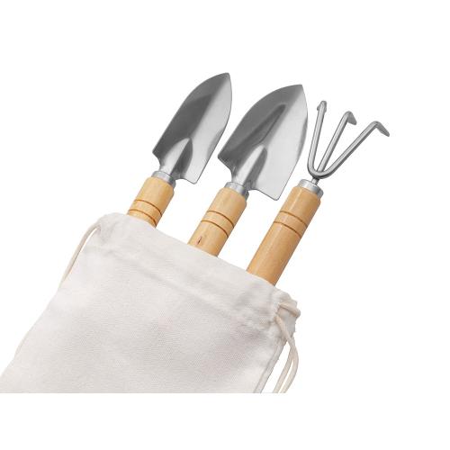 Садовый набор из 3 аксессуаров из нержавеющей стали с бамбуковыми ручками. Включает большую и малую лопатки и грабли. В комплект входит хлопковый мешочек.