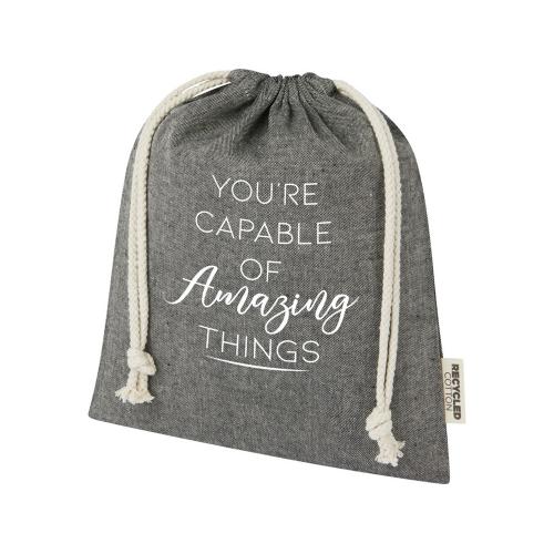 Подарочная сумка из хлопка, переработанного по стандарту GRS, с хлопковым шнурком для затягивания. Идеально подходит для подарков или хранения предметов. Размер: 25 x 30 см.