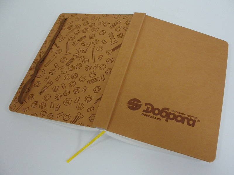 Ежедневник «Доброга» с коричневой резинкой и желтым ляссе.